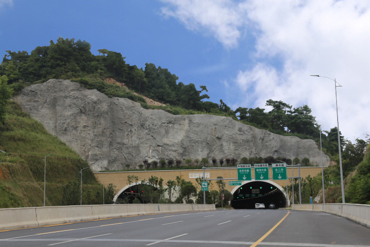 3、隧道口上方邊坡運用國畫中白描手法將貴州獨特的山、水、田園風光巧妙的融為一體,運用不同色彩的植物劃分,塑造層次豐富,立體感的垂直綠化景觀。